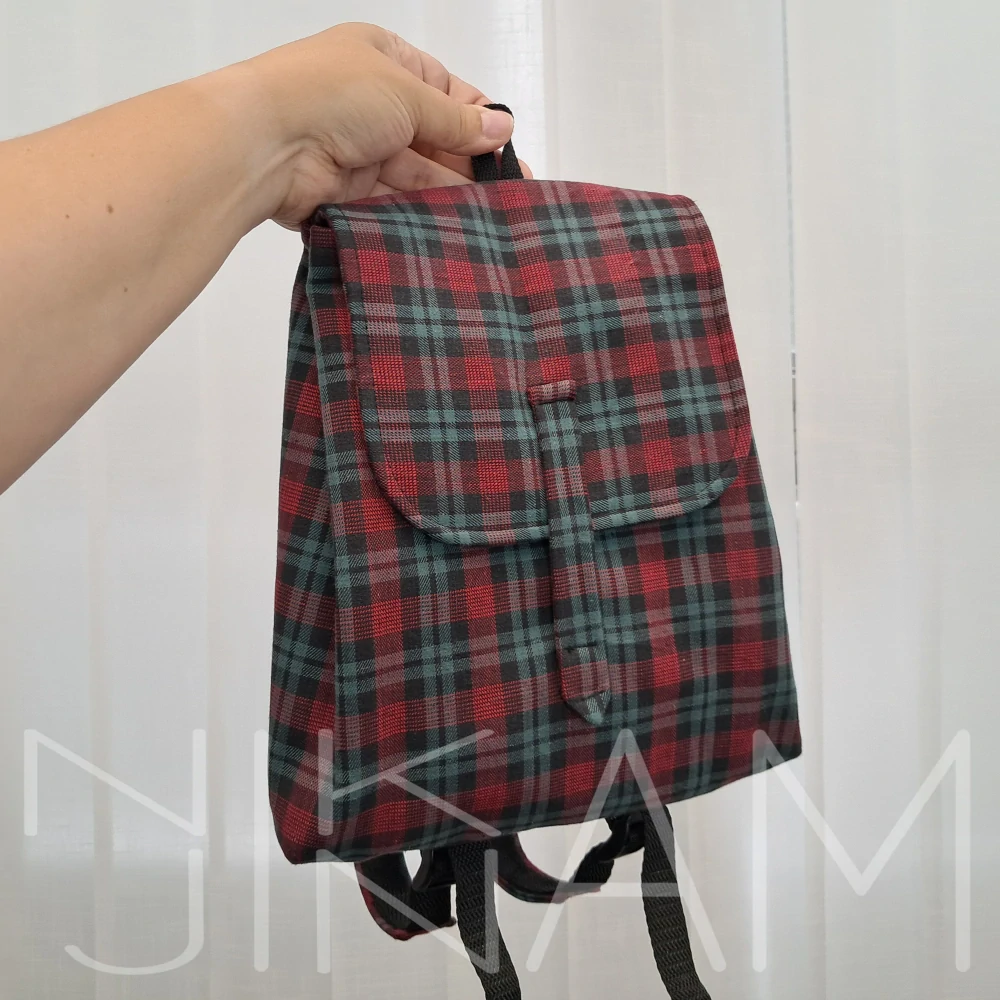 Batůžek je ušit z červeného flanelu a černé podšívky. Nastavitelné ramenní popruhy, velikost vhodná pro dospělé a starší děti.