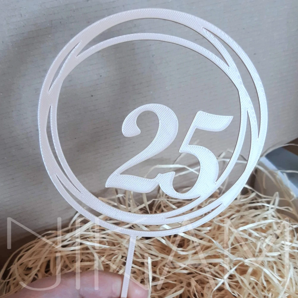 Personalizovaný narozeninový zápich. Do kruhu můžeme napsat číslici, nebo třeba jméno. Font vždy volíme tak aby co nejlépe seděl do kruhu. Můžete zvolit jednobarevnou nebo dvoubarevnou verzi, v tom případě bude číslice v jiné barvě.