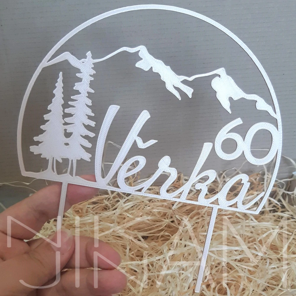 Personalizovaný narozeninový zápich. Můžete nechat napsat jméno a číslo nebo jen jedno z toho. Font vždy volíme aby co nejlépe seděl do zápichu. Můžete zvolit jednobarevnou nebo dvoubarevnou verzi, v tom případě bude jméno a číslice v jiné barvě než hory a stromy.