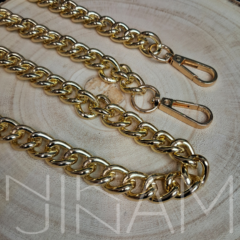 Kovový řetízek s velkými očky na kabelky nebo větší psaníčka. Na obou jeho koncích najdete připevněné karabinky. Působí masivně, ale je lehký, hmotnost jen 142 gramů