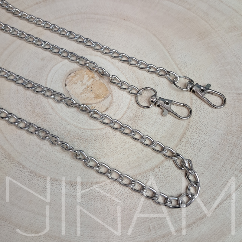 Kovový řetízek na kabelky, psaníčka nebo mobilní telefon. Na obou jeho koncích najdete připevněné karabinky. Není určen na velkou zátěž. Hmotnost 58 gramů.délka: 120 cmšíře: 6 mmMateriál: kov celý popis
