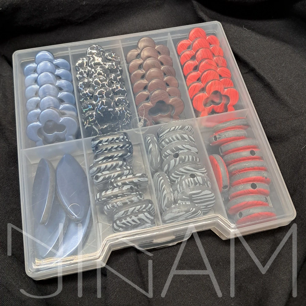 - Sada plochých korálků v plastové krabičce