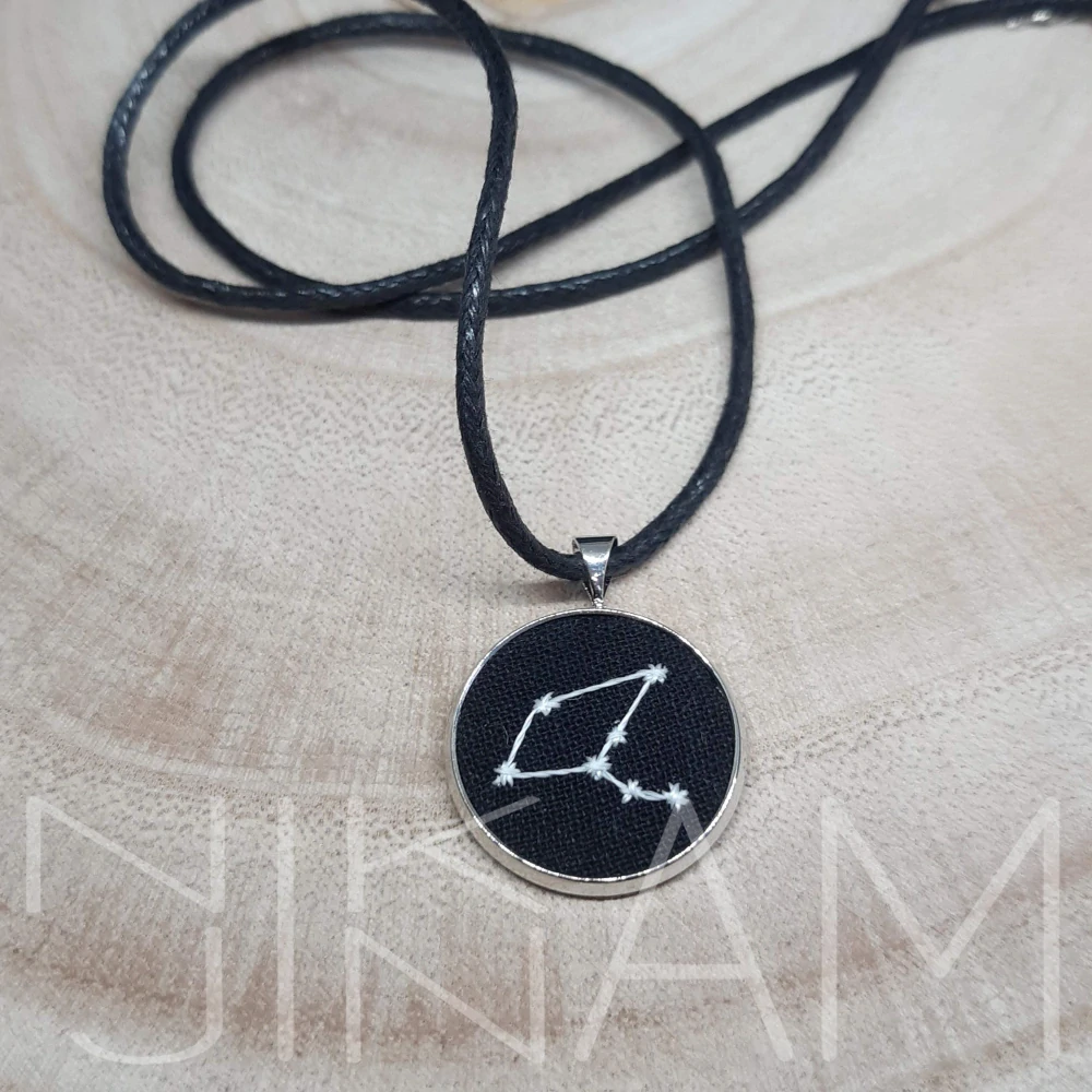 Souhvězdí berana ručně vyšité na černém bavlněném plátně. Motiv je vyšíván speciální nití, která po vystavení slunci nebo světlu z lampy po dobu 30 sekund ve tmě svítí.
