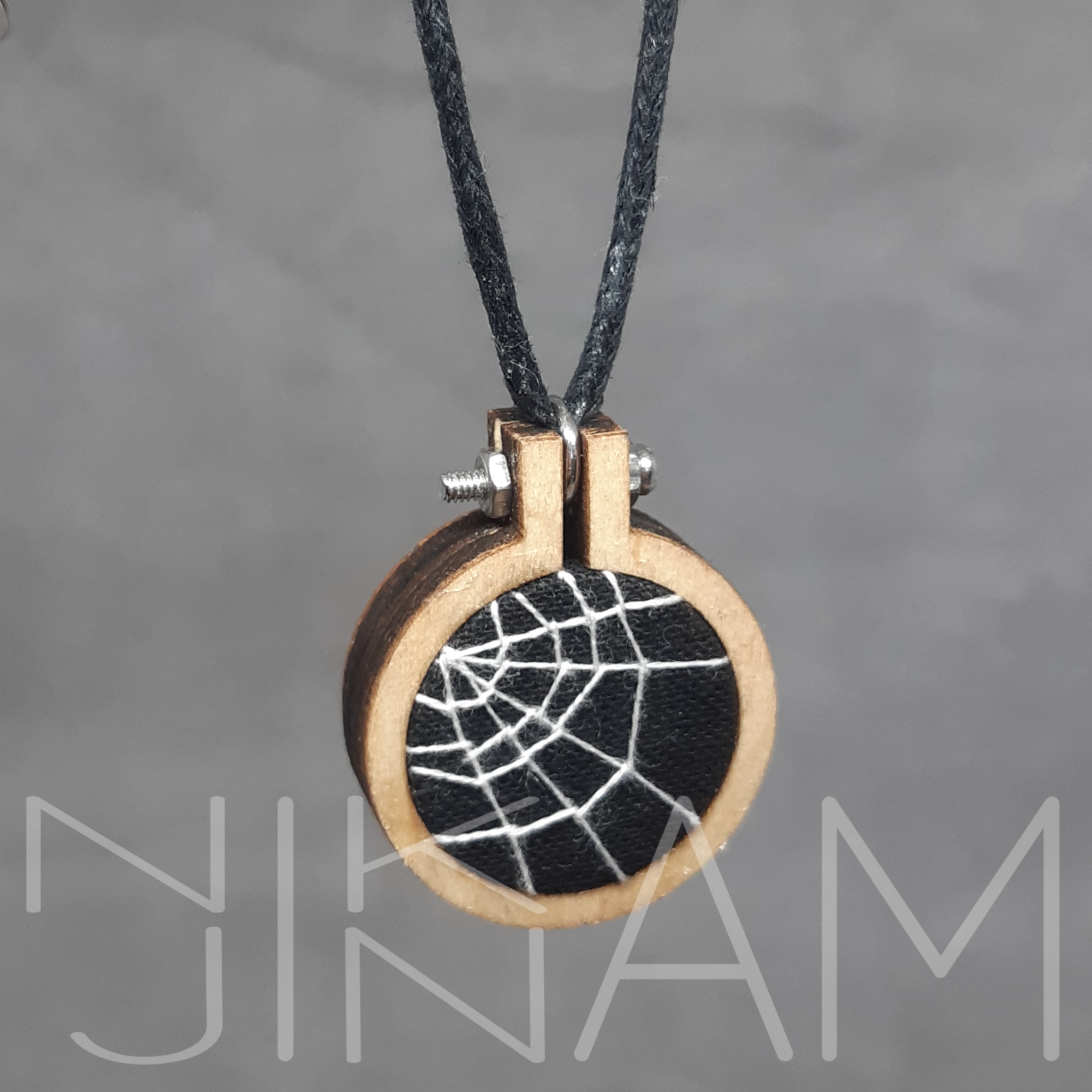 Bílá pavučina ručně vyšitá na černém bavlněném plátně. Výšivka je zasazena do miniaturní dřevěné napodobeniny vyšívacího kruhu o průměru 25mm. Přívěšek je zavěšen na povoskované bavlněné šňůrce s kovovým zapínáním o délce 45cm s možností 5 cm prodloužení.